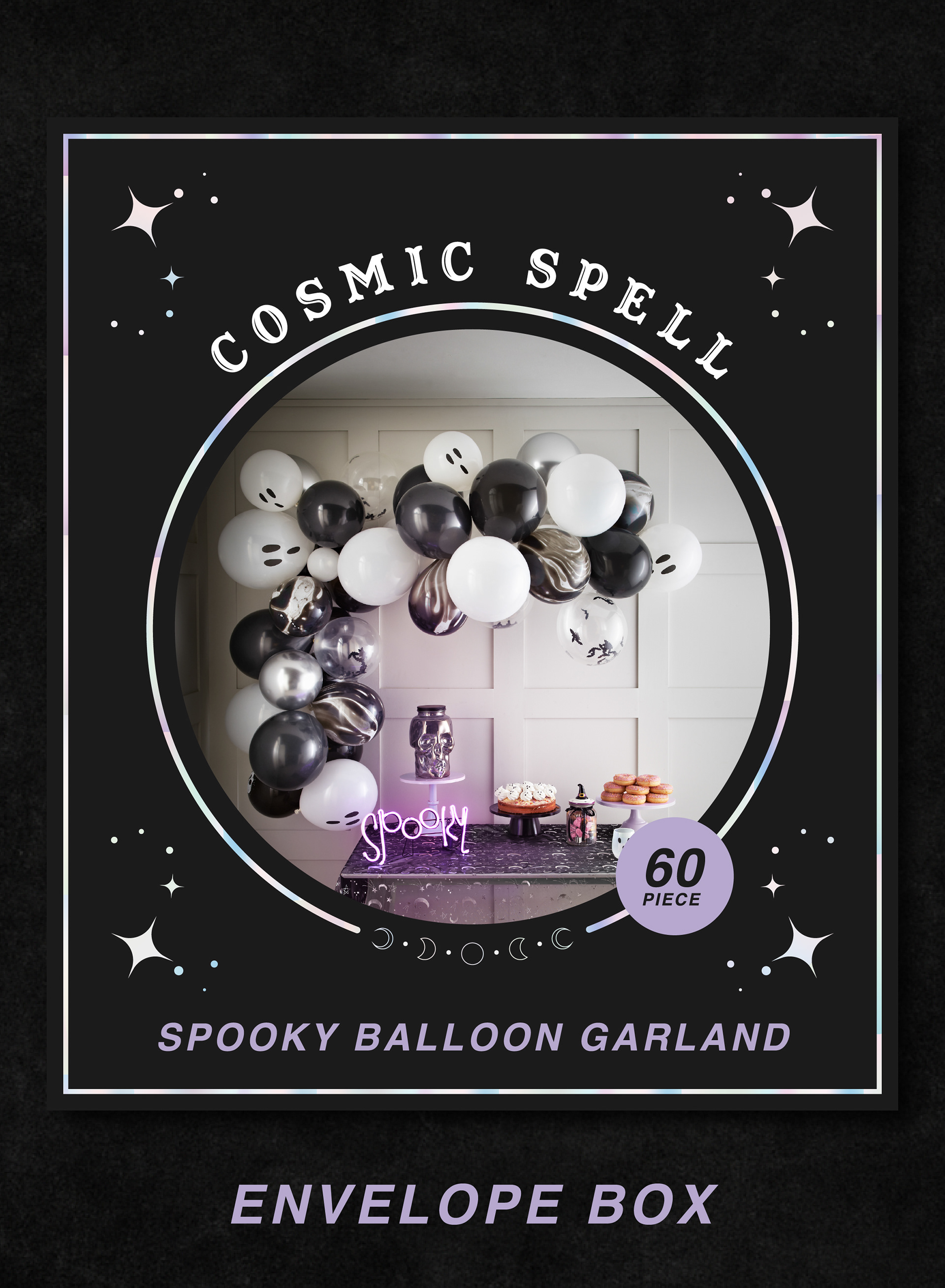I found inspiration for Cosmic Spell in the visuals surrounding seances, tarot cards, ouija boards, and the more playful side of gothic subculture. The aim was to create a packaging concept that felt both mystical and accessible, moving away from the typical motifs of Halloween decor.
